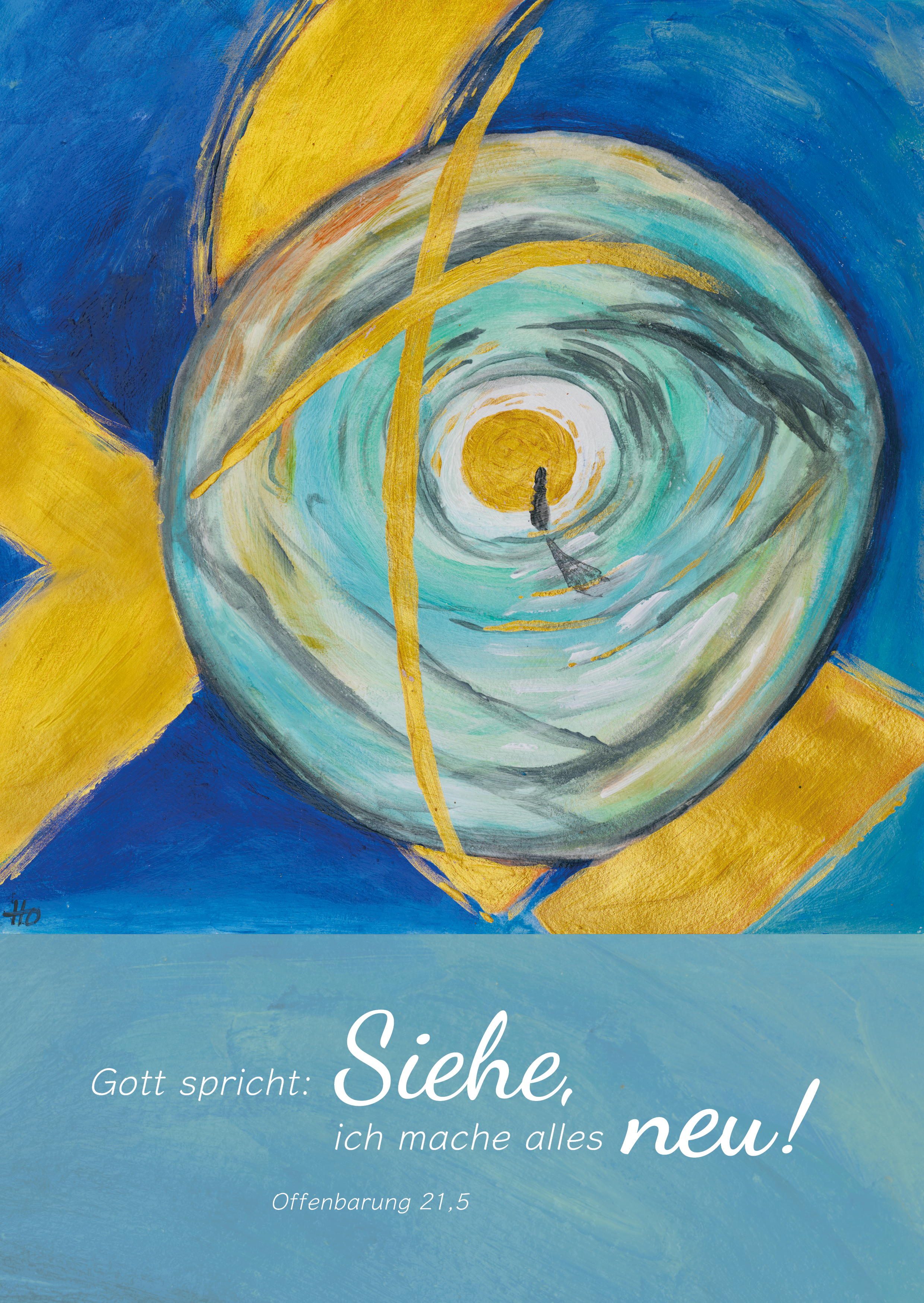 Gerade habe ich die kurze Jahreslosung für 2026 vom „neu machen“ überflogen. Nun schaue ich auf das Bild, das Doris Hopf zu diesem Bibelwort gestaltet hat. Die Fragen, die sich relativ spontan bei mir eingestellt haben, schwirren dabei weiter durch meine Gedanken. Und die Waage in meinem Kopf senkt sich beim schnellen Blick auf das Bild sogleich auf die „alles beim Alten“-Seite: Irgendwie meine ich die Silhouette eines goldenen Ichthys-Fisches im Hintergrund wahrzunehmen. Sie ist zwar nur ausschnittweise zu erkennen, denke ich. Aber auf tiefblauem Hintergrund schwimmt der Fisch dahin. Ganz klar. Ein Fischauge glubscht im Vordergrund. Ein Kreuz sehe ich auch. Eben irgendwie „alles beim Alten“ – was auch immer diese Motive mit der Jahreslosung zu tun haben mögen?!